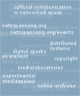netzspannung.org, the Internet platform of the CAT project, will be online from September 2001. Conceived as a media laboratory on the Internet, netzspannung.org combines artistic production and inter-media research into a collaborative knowledge space. |
