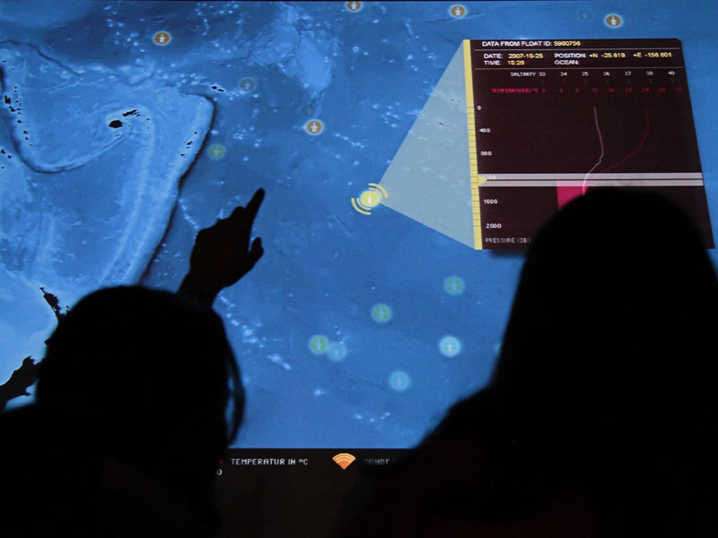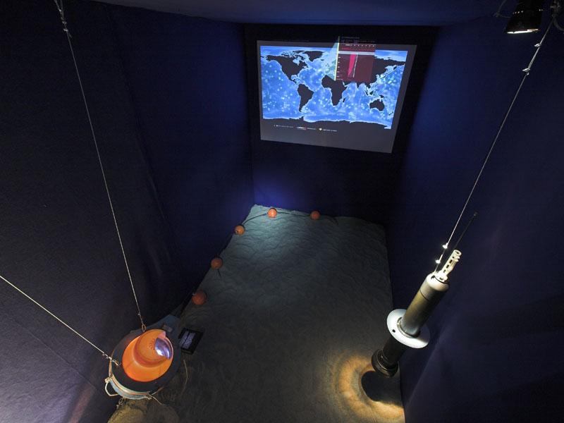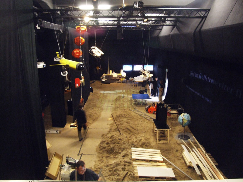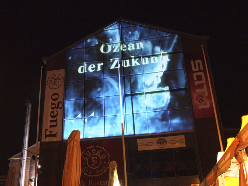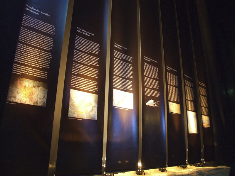 Aufgabe unseres Teams war die Konzeption und Umsetzung der projektbegleitenden Ausstellung, die einen emotionalen Zugang zu den wissenschaftlichen Themen der Meeresforschung ermöglicht. Dafür kamen verschiedene Medieninstallationen zum Einsatz: Eine filmische Deckenprojektion, eine interaktive Bodenprojektion, typografische Inszenierungen an Wand und Fassade. Informationsterminals liefern Hintergrundwissen zu den ausgestellten Exponaten.